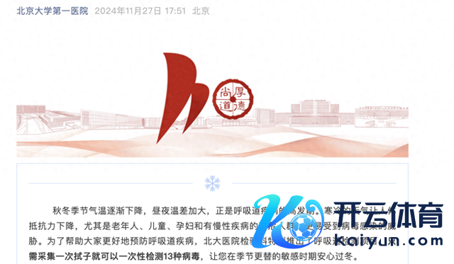 (东谈主民日报健康客户端 记者 高瑞瑞 赵萌萌)秋冬季节是呼吸谈疾病的高发期。11月27日,据北京大学第一病院官网音问kaiyun体育,北大第一病院推行科开展的呼吸谈病原体检测技俩,只需汇集一次拭子就不错同期检出13种常见的呼吸谈病原体,包含甲型病毒、甲型流感病毒 H1N1、甲型流感病毒 H3N2、副流感病毒、乙型流感病毒、偏肺病毒、呼吸谈合胞病毒、腺病毒、鼻病毒、博卡病毒、冠状病毒、肺炎支原体、衣原体。