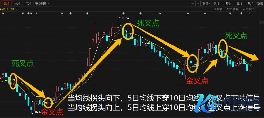 要是均线是拐头进取呈现多头胪列,5日均线上穿过10日均线,两线交叉造成一个交点——金叉点,不错看作是短期可能飞腾的信号,短期主办契机。