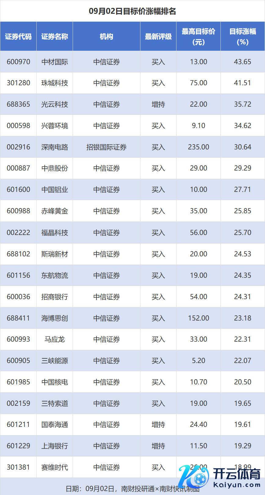 南财投研通数据清晰,9月2日,券商给以上市公司贪图价共33次,按最新收盘价狡计,贪图价涨幅排行居前的公司有中材外洋、珠城科技、光云科技,贪图价涨幅永别为43.65%、41.51%、35.72%,永别属于专科工程、家电零部件、IT作事行业。