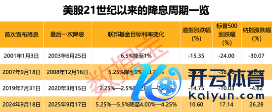 回来历史,2000年以来,好意思联储共出现4个降息周期,分手为2001年1月3日—2003年6月25日、2007年9月18日—2008年12月16日、2019年8月1日—2020年3月16日,以及2024年9月19日于今。这四轮降息均反应了经济放缓或通胀压力减轻的信号,各周期也有其特有的触发成分。