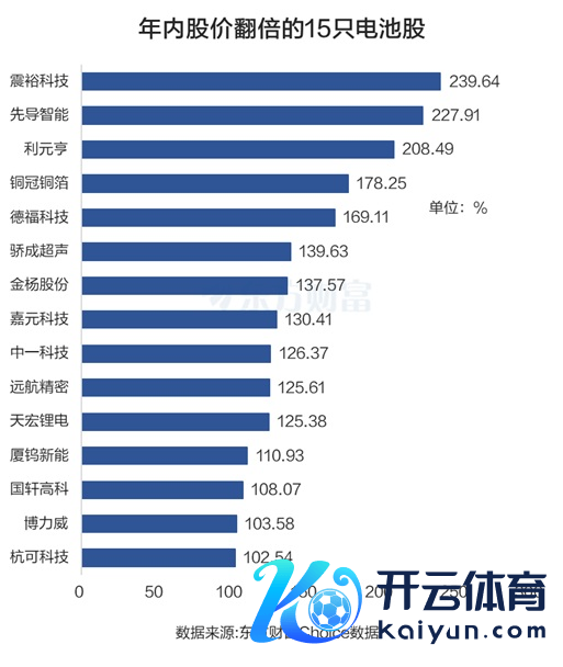 全体而言,电板板块的105只个股,年内有102股上升,上升占比约97%。其中93股涨超10%,51股涨超50%,15股股价翻倍。整个105只个股kaiyun官方网站,年内上升中位数为49.7%。