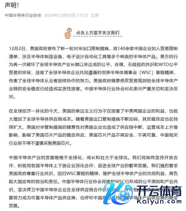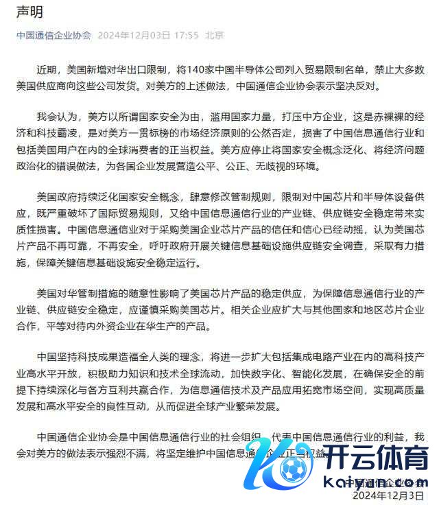 中国通讯企业协会在声明中示意,好意思国将140家中国半导体公司列入贸易限制名单,中国通讯企业协会示意矍铄反对。