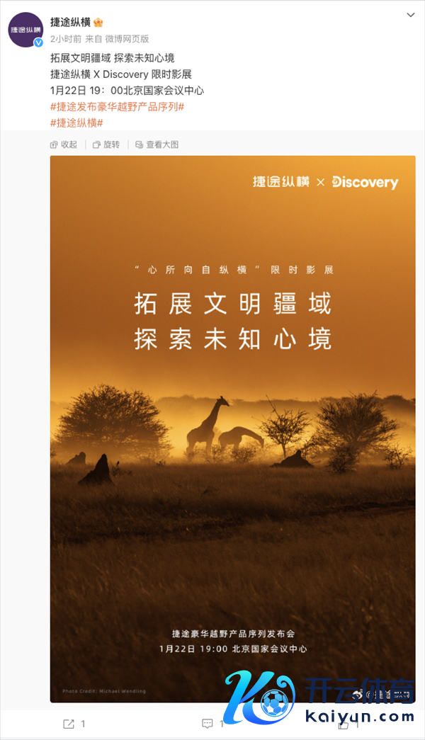 快科技1月16日讯息kaiyun官方网站,奇瑞旗下捷途汽车文书,将于1月22日19:00举行新品发布会,届时将推出全新豪华越野系列——捷途纵横,首车定位豪华越野SUV,对标坦克700。