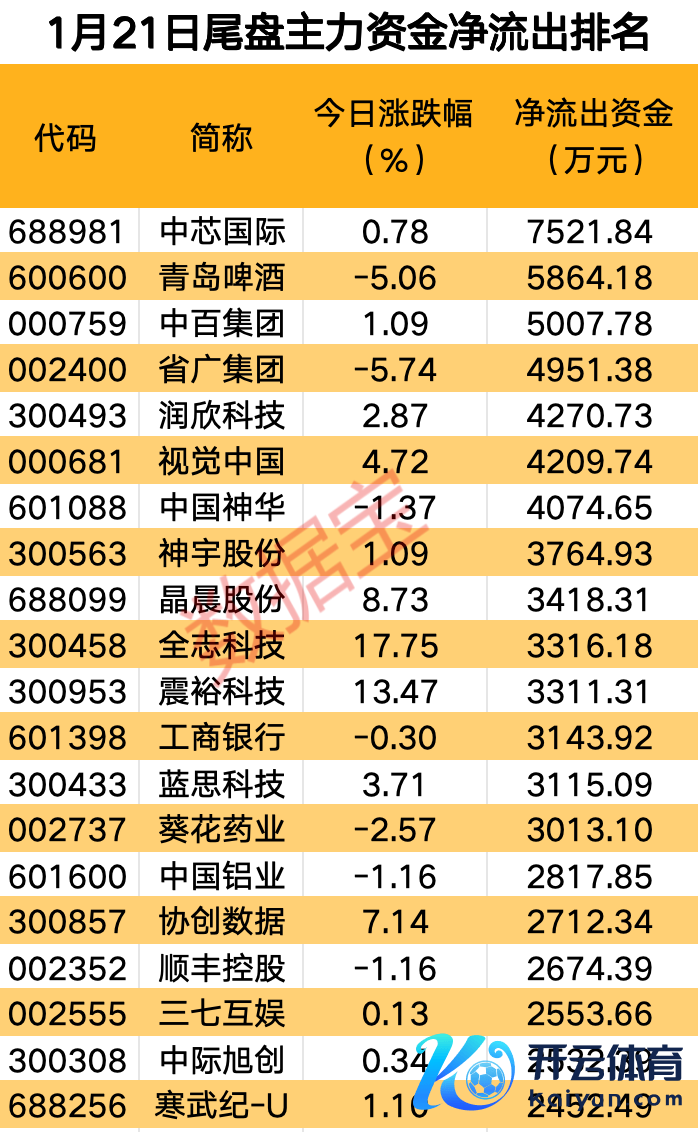 14股尾盘主力资金净流出超3000万元,其中3股尾盘净流出金额超5000万元,差异为中芯海外、青岛啤酒、中百集团。