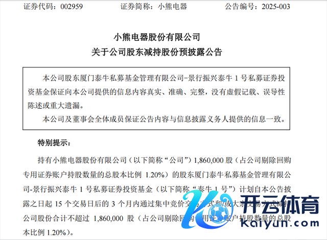 1月14日,小熊电器同步败露了一则股东减握公告。公告败露,公司股东门泰牛私募基金经管有限公司旗下的景行振兴泰牛1号私募证券投资基金(以下简称 “泰牛1号”)诡计通过聚拢竞价交往和/或巨额交往的样貌,减握公司股份统统不进步186万股。这一减握限制,占公司剔除回购专用证券账户握股数目后总股本的1.20%。