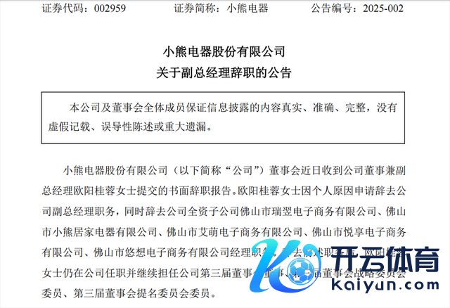 1月14日,小熊电器发布公告,公司董事兼副总司理欧阳桂蓉因个东谈主原因,安谧提交辞呈,辞去副总司理一职。与此同期,她还一并辞去在佛山市瑞翌电子商务有限公司、佛山市小熊居家电器有限公司、佛山市艾萌电子商务有限公司、佛山市悦享电子商务有限公司、佛山市悠念念电子商务有限公司等多家全资子公司担任的司理职务。