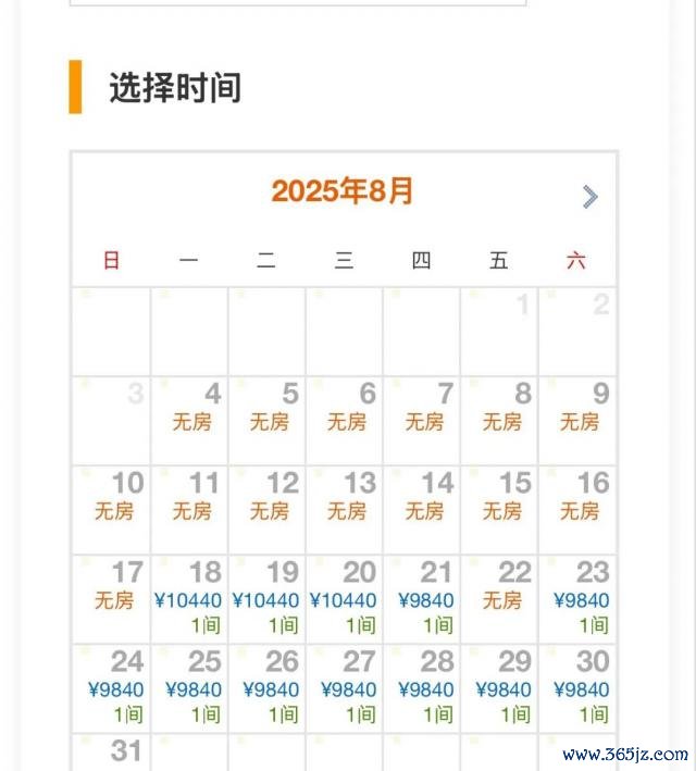 以 270° 不雅景大床房为例,8 月 17 日前,两天一晚简略三天两晚的住宿已显示无房。价钱方面,以两天一晚的住宿为例,其价钱因为日历、房型和佩带儿童年岁不同有所别离,8 月最廉价钱为 5280 元, 2 名成东谈主带一儿童(12 周岁以上儿童)在 8 月 18 日到 20 日历间入住两天一晚价钱为 10440 元。