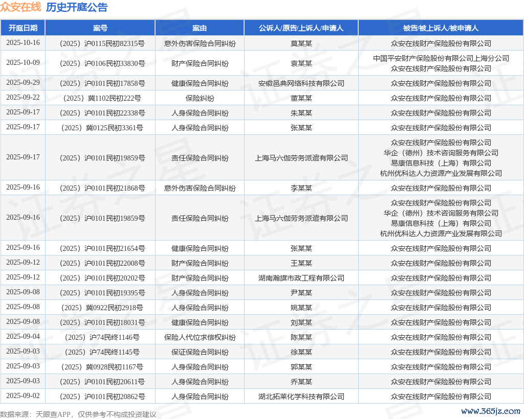 本站音书,凭证天眼查APP表现,近日公布了一则众何在线财产保障股份有限公司手脚被告/被上诉东谈主的开庭公告,详备执行如下:
