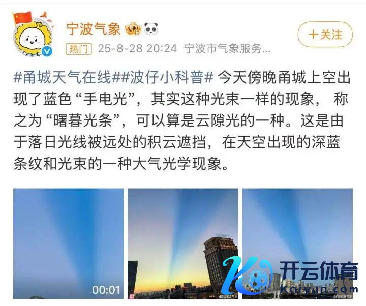 宁波市怡悦行状中心也科普说,其实这种像蓝色“手电光”光束相似的征象, 称之为“曙暮光条”,不错算是云隙光的一种。这是由于落日光泽被辽远的积云装潢,在天出门现的深蓝条纹和光束的一种大气光学征象。