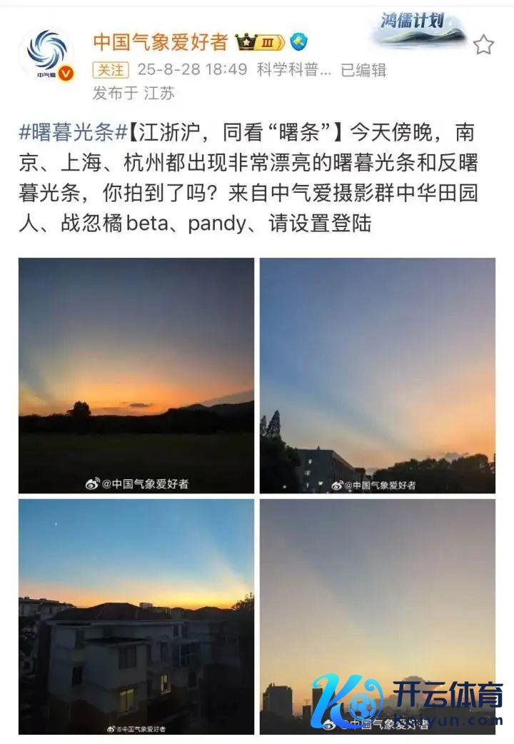 除了杭州,昨天江浙沪齐在同看“曙条”,中国怡悦疼爱者说,昨天傍晚,南京、上海、杭州齐出现终点漂亮的曙暮光条和反曙暮光条。(两者是统一种征象,仅仅不雅测角度不同)